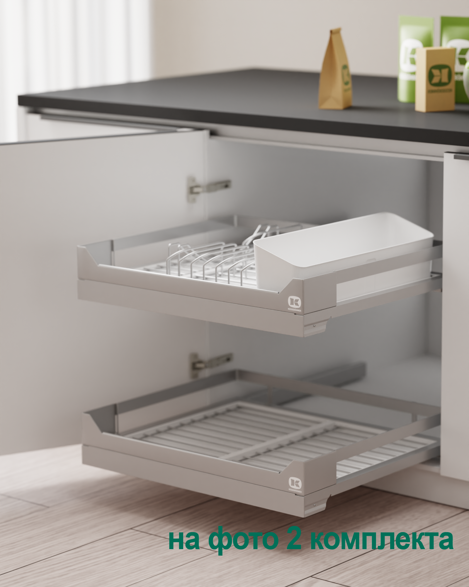 2 модуля для посуды большие (423 x 248 мм, каждый модуль состоит из 1 х держатель металлический, 1 х поддон пластиковый, 2 х защелка-ограничитель)