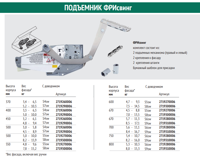Подъемник ФриСвинг S9sw H670 - 800 мм 8,0-17,1 кг без крышек, без штанги